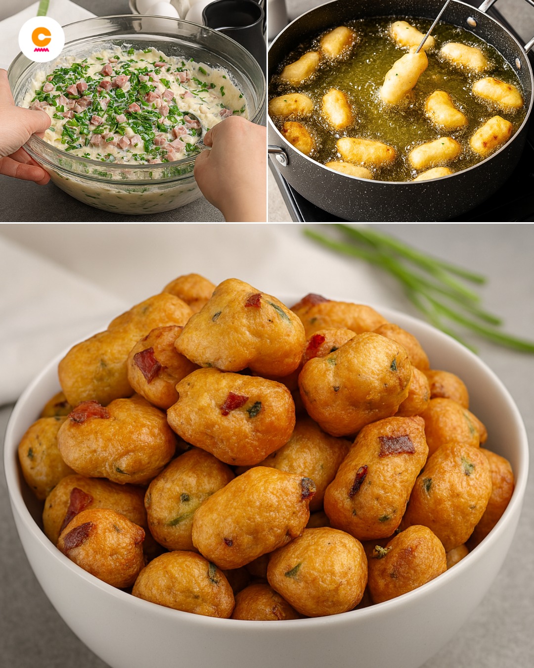 These are small, pan-fried fritters made from a yeasted batter enriched with eggs, flour, sliced sausages, and aromatic spices. The batter is left to rest briefly, allowing the yeast to create a light and airy texture. They’re similar to savory beignets or Asian-inspired fritters, thanks to the five-spice powder and green onions that infuse them with bold flavor in every bite.