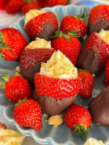 Fill the Strawberries: Next, spoon the cold cheesecake filling into a piping bag fitted with a large star tip. Gently fill each hollowed-out strawberry with the cheesecake mixture. If you don’t have a piping bag, a zip-top bag with a corner cut off will work as well. *Make sure to resist the urge to over fill, fill the center and pipe a bit above the lip otherwise the cream cheese filling will be too top heavy.