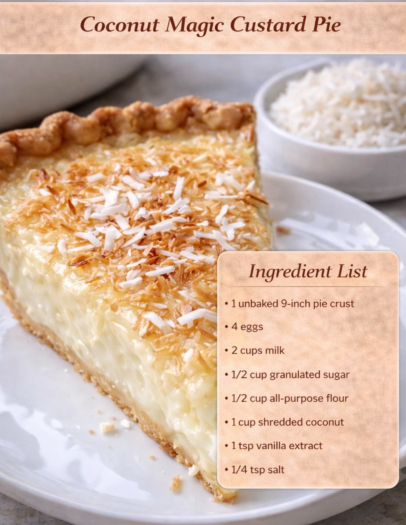 Coconut Magic Custard Pie is ideal for holidays, potlucks, family dinners, and nostalgic dessert tables. It uses simple pantry staples, comes together quickly, and delivers impressive results every time. Served chilled or at room temperature, it’s a dessert that feels both humble and elegant.