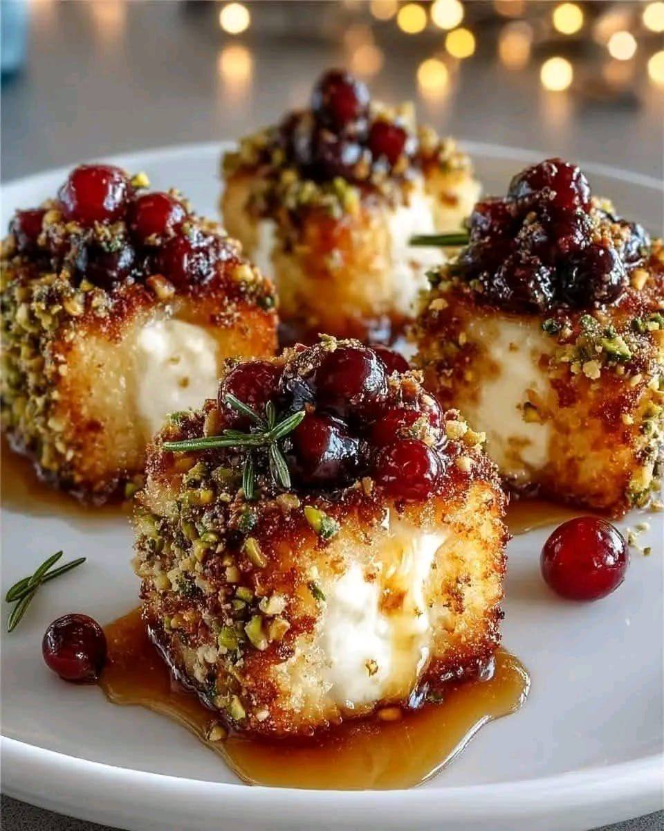Golden, crisp brie bites with a gooey center, coated in crunchy pistachios and topped with a sweet-tart glaze. An elegant and irresistible appetizer perfect for holiday gatherings or special occasions.